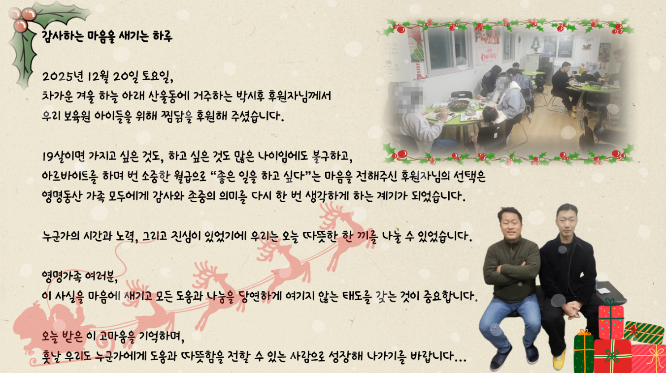 2025년 12월 20일, 추운 겨울날 우리 아이들을 위해 따뜻한 마음을 전해주신 박시후 후원자님 덕분에 영명동산에는 온기가 가득한 하루가 되었습니다.